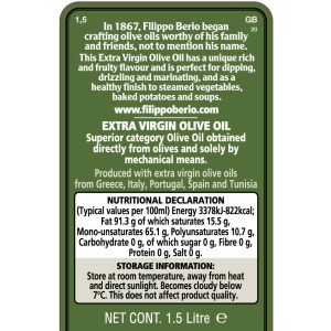 Filippo Berio Extra Virgin Olive Oil has a unique rich and fruity flavour and is perfect for dipping, drizzling and marinating, and as a healthy finish to steamed vegetables, baked potatoes, soups, meat and fish