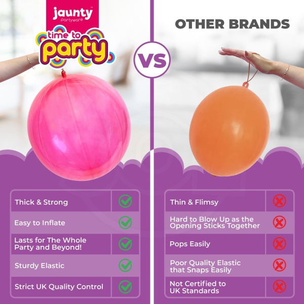 Details: EXTRA STRONG BALLOONS – Don’t be afraid to play rough with our Heavy Duty Punch Balloons – they have been designed to withstand all uses at any kind of event. Each Punch Balloon is crafted from 8g thick STRONG Natural Latex material, more durable than the usual 6-7g latex balloons from other sellers PACKED IN ASSORTED COLOURS – Each pack contains 25 Party Bag Balloons in assorted colours, including purple, blue, yellow, orange, red, green and pink punch balloons. The Large Balloons are all solid in colour with no unwanted or inconsistent prints, which works well with any event and party fillers. HIGH-QUALITY ELASTIC BANDS – The elastic bands attached to our inflatable Punch Balloons are reassuringly robust and won’t easily break whilst using them, due to their high strength and elasticity. They are securely attached to the balloons, so you won’t need to reattach them, saving you precious time whilst preparing for and during your event. VERSATILE USE – Our Extra Large Punch Balloons with Elastic are highly versatile and can be used for a variety of different occasions including Kids Parties, Birthday Parties, Halloween, Christmas, New Years and many other events. These can be used as Party Bag Fillers for Kids for a Childrens Party and for Loot Bags and Party Favours COMPLIMENTARY BALLOON GAME EBOOK – We want you to get the best from your purchase, which is why we have included a complimentary Ebook for each order. This contains details of a fantastic variety of games that can be played with our party balloons as well as an instruction guide and video for inflating the Punch Balloons. jaunty partyware 25 Large Punch Balloons | Ideal for Party Bag Fillers | 12″ Premium Quality | Includes Balloon Games Ebook