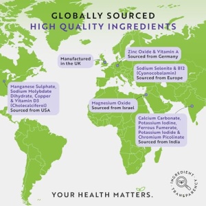 - ✔ WHAT 26 VITAMINS AND MINERALS ARE IN OUR SUPPLEMENT? – Each tablet contains Vitamin A (sourced from Germany), Vitamin D3 (sourced from USA), Vitamin E, Vitamin K, Vitamin C, Thiamin, Riboflavin, Niacin, Vitamin B6, Folic Acid, Vitamin B12 (sourced from Europe), Biotin, Pantothenic Acid, Potassium, Chloride, Calcium, Phosphorus, Magnesium, Iron, Zinc (sourced from Germany), Copper (sourced from USA), Manganese, Selenium, Chromium, Molybdenum, and Iodine.