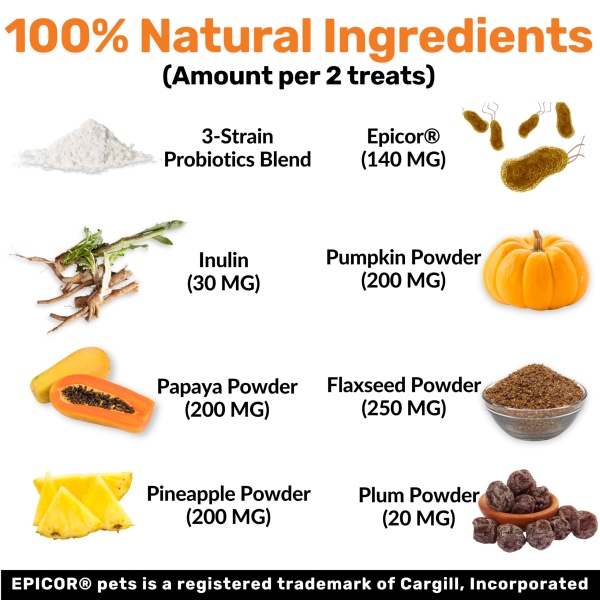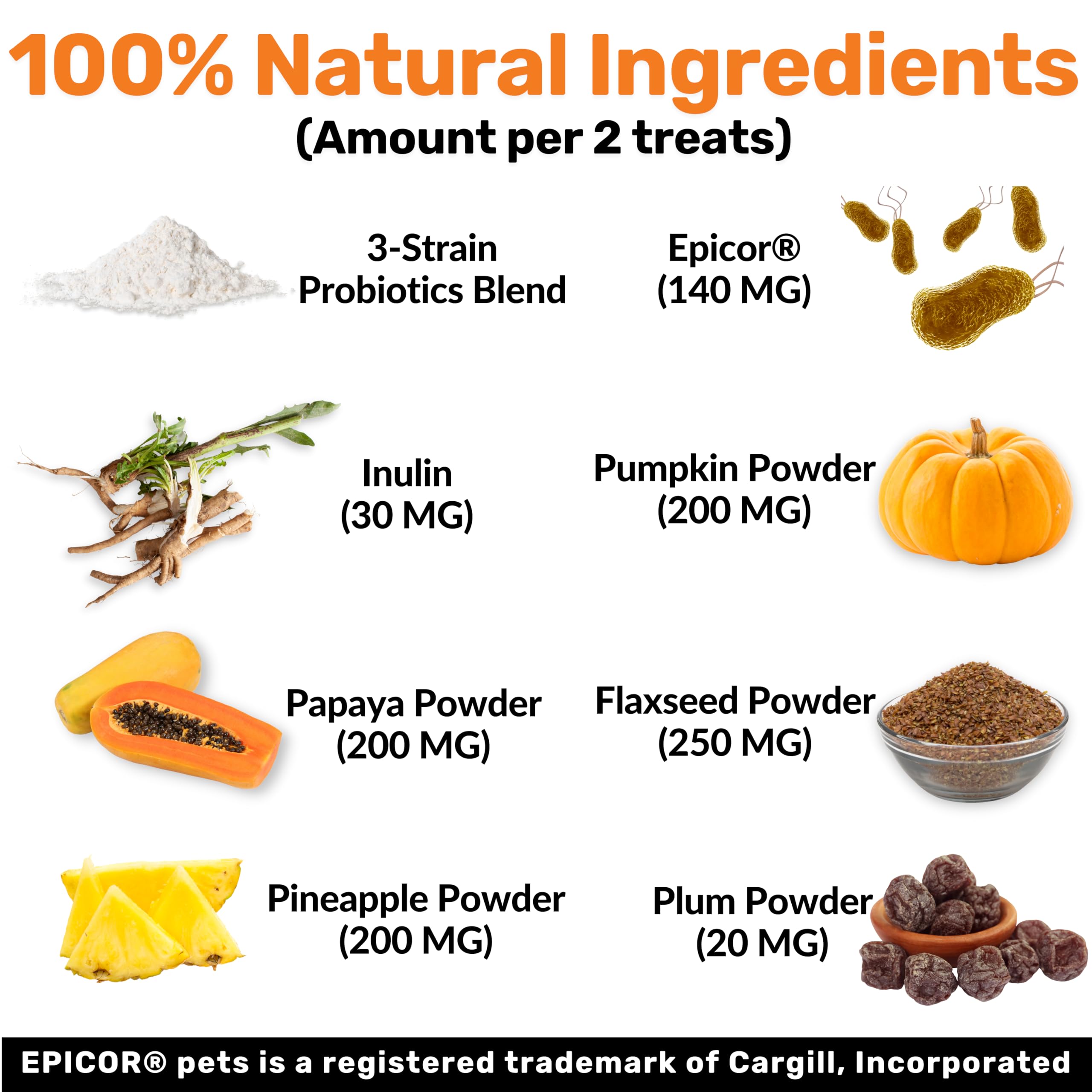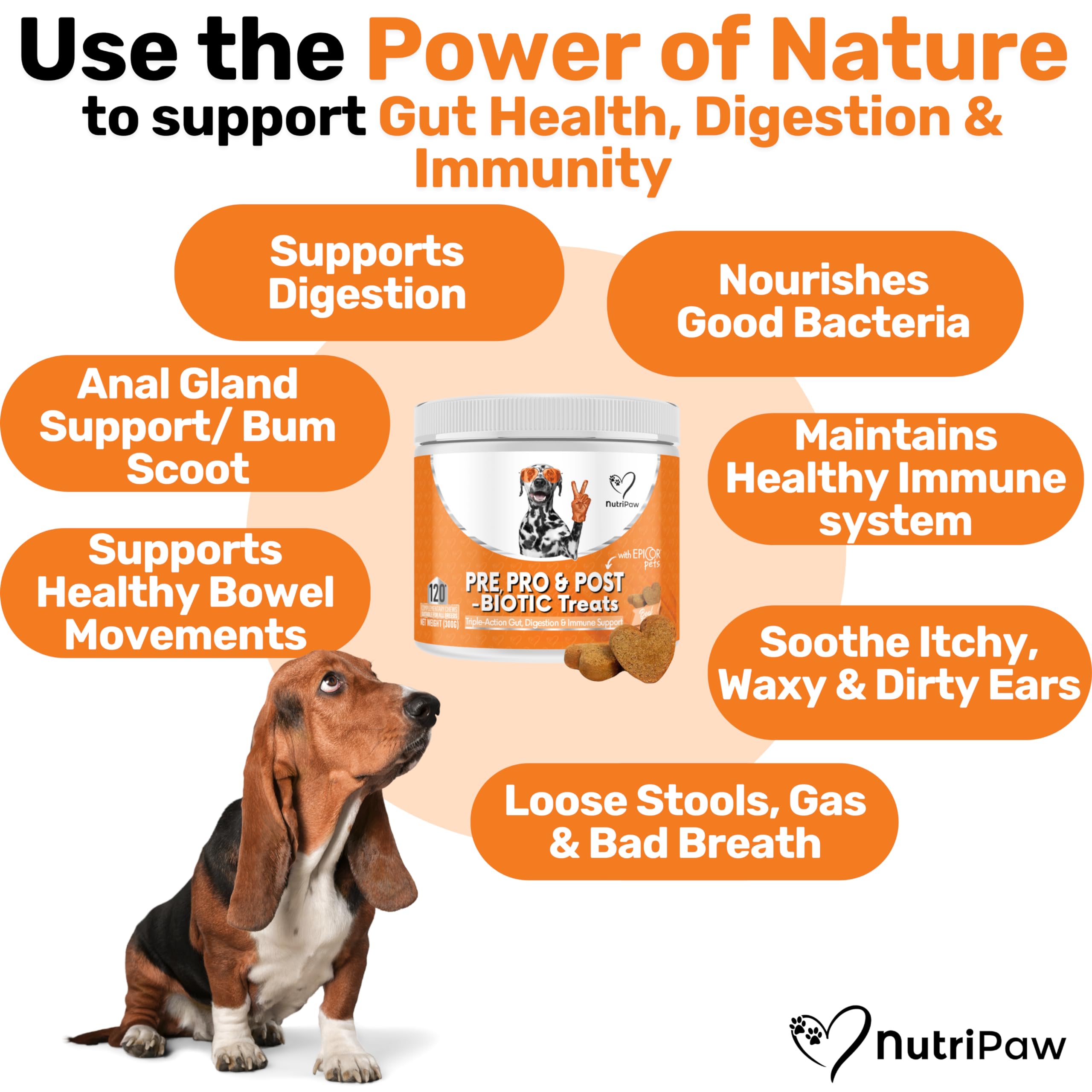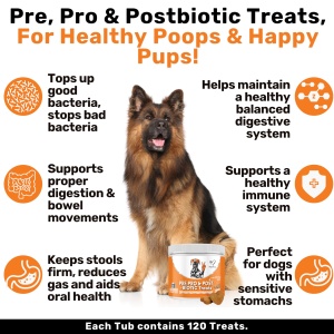 Details: 120 Natural Treats to support your dog’s Digestion, Immunity & Gut Health. Loved by over 80,000 dogs across the UK. Support your dog’s bum-scooting, grass-eating, itchy ears and soothe their sensitive stomach. Our vet-approved treats are scientifically formulated to help support your digestion & immunity and nourish healthy gut bacteria. Feed the treats at the correct serving size daily, for best results please allow up to 30 days. It is a natural product so normal not to see results in the first few weeks. We recommend increasing the quantity up to 2x if you see 0 results after 2 weeks. Every dog responds slightly differently and this increase works for most dogs. For dog use only, keep out of reach of children and other animals. Do not feed pups under 12 weeks. Check with a vet before feeding pregnant or nursing dogs. In case of accidental overdose, please contact a vet. Store in a cool dry place. Do not use if the internal seal is broken or missing