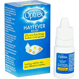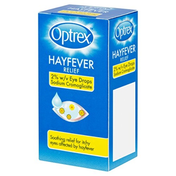 Optrex Hayfever Relief 2 Percent W/V Eye Drops Sodium Cromoglicate, Hayfever Eye Drops, 10 ml Allergic conjunctivitis causes red, watery, itchy eyes. A common cause is an allergy to pollen in the hay fever season. Other less common causes are allergies to house dust mite and cosmetics, and problems with contact lenses. Sodium cromoglicate eye drops relieve the symptoms of allergic conjunctivitis by reducing the release of a chemical called histamine which causes inflammation. They are suitable for use in adults and children. The drops are available on prescription, and you can also buy them at a pharmacy and other retail outlets, without a prescription.