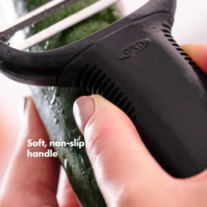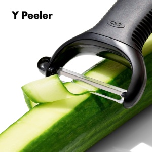 Named for its shape, the Y peeler features a sharp, stainless steel blade that glides through even the toughest fruit and vegetable skins with ease. The soft, comfortable handle cushions your hand as you peel, and is non-slip, even when your hands are wet.