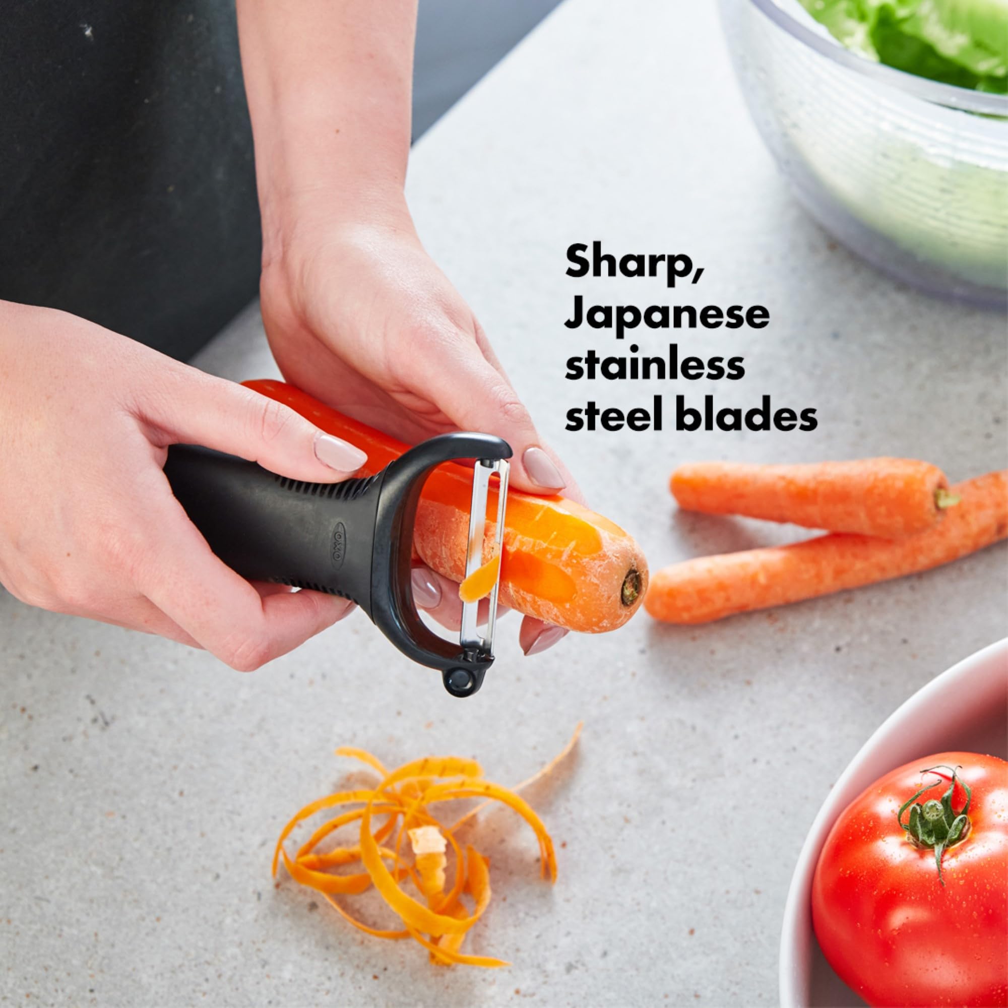 - Sharp, hardened stainless steel blade easily peels cucumbers, apples, carrots and more
