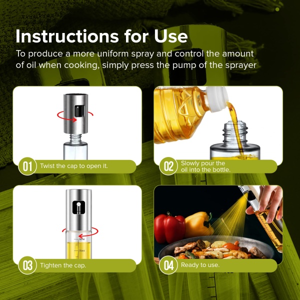 - 100ml large capacity with a generous capacity, our oil sprayer allows you to store enough oil for multiple uses.