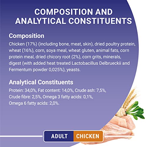 Additives: Nutritional additives: IU/kg: Vit A: 33 000; Vit D3: 1 000; Vit E: 460; mg/kg Vit C: 140; Taurine: 700; Ferrous sulphate monohydrate: 204; Calcium iodate anhydrous: 2.6; Cupric sulphate pentahydrate: 41; Manganous sulphate monohydrate: 97; Zinc sulphate monohydrate: 340;Sodium selenite: 0.24. With antioxidants. Composition : Chicken (17%), dried poultry protein, wholegrain wheat (17%), maize, wheat gluten meal, animal fat, maize gluten meal, maize grits, dried chicory root, soya meal, minerals, digest (with added heat treated Lactobacillus Delbrueckii and Fermentum powder 0.025%), yeast. Composition : Chicken (17%), dried poultry protein, wholegrain wheat (17%), maize, soya meal, wheat gluten meal, animal fat, maize gluten meal, dried chicory root, maize grits, minerals, digest (with added heat treated Lactobacillus Delbrueckii and Fermentum powder 0.025%), yeast. Additives: Nutritional additives: IU/kg: Vit A: 33 000; Vit D3: 1 000; Vit E: 690; mg/kg: Vit C: 140; Taurine: 700; Fe(E1): 225; I(E2): 2.9; Cu(E4): 45; Mn(E5): 94; Zn(E6): 380; Se(E8): 0.25. With antioxidants. Composition: Chicken (17%), dried poultry protein, wholegrain wheat (17%), maize, soya meal, animal fat, wheat gluten meal, maize gluten meal, maize grits, dried chicory root (2%), minerals, digest, yeast (1%), fish oil.